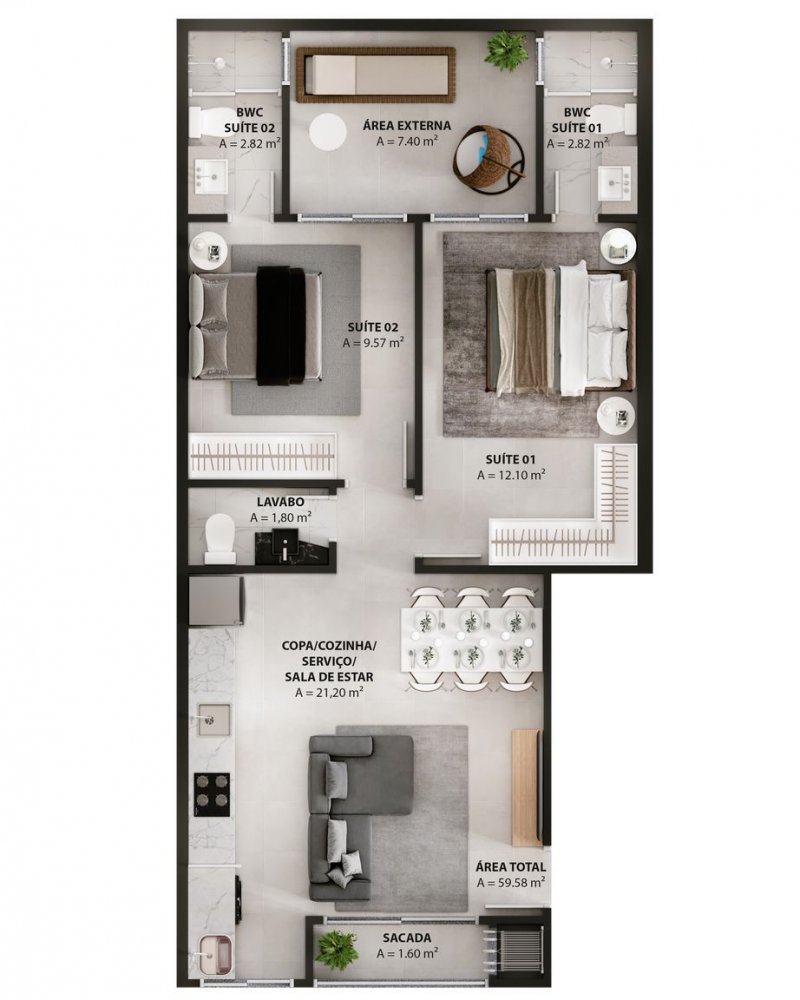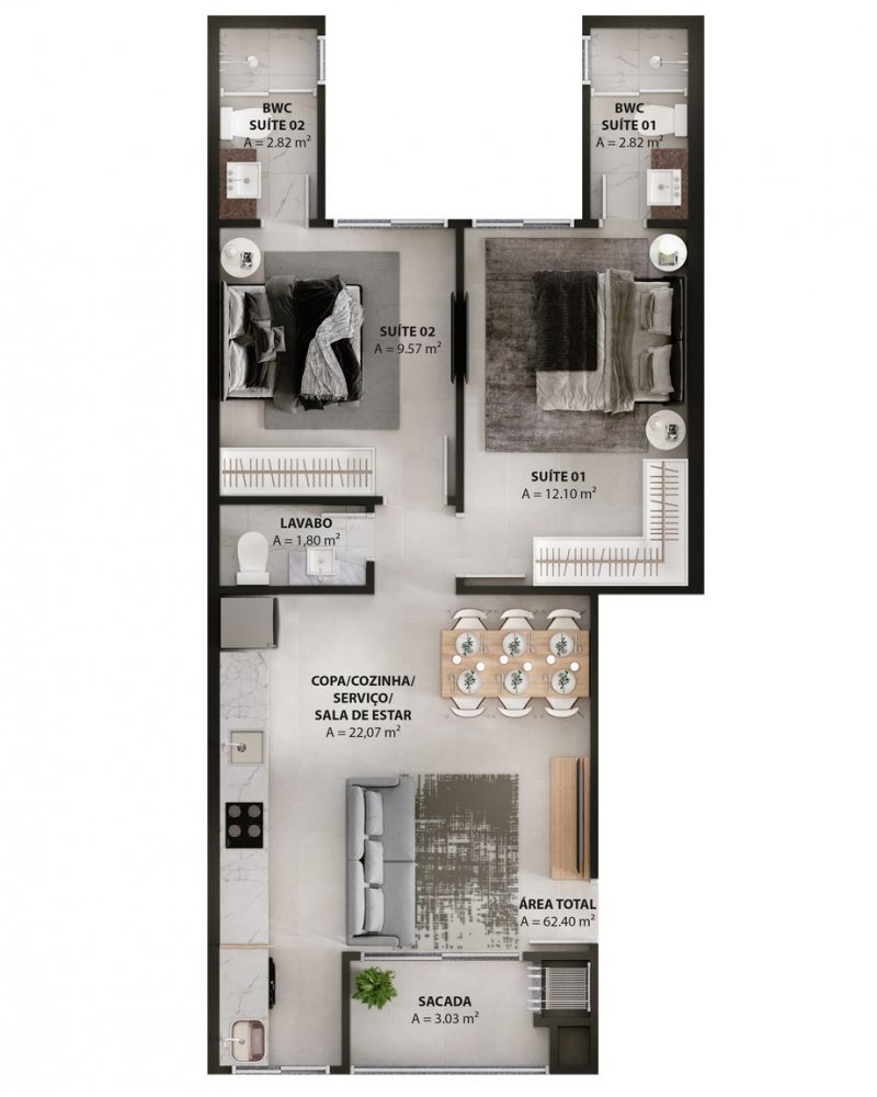 - Área Total: 62 m²