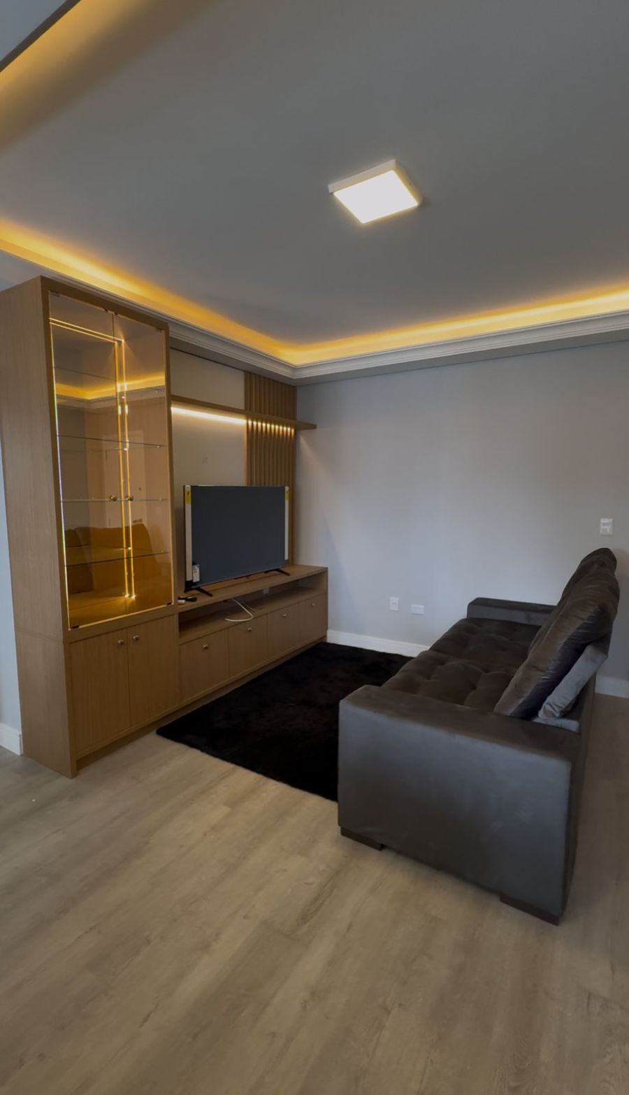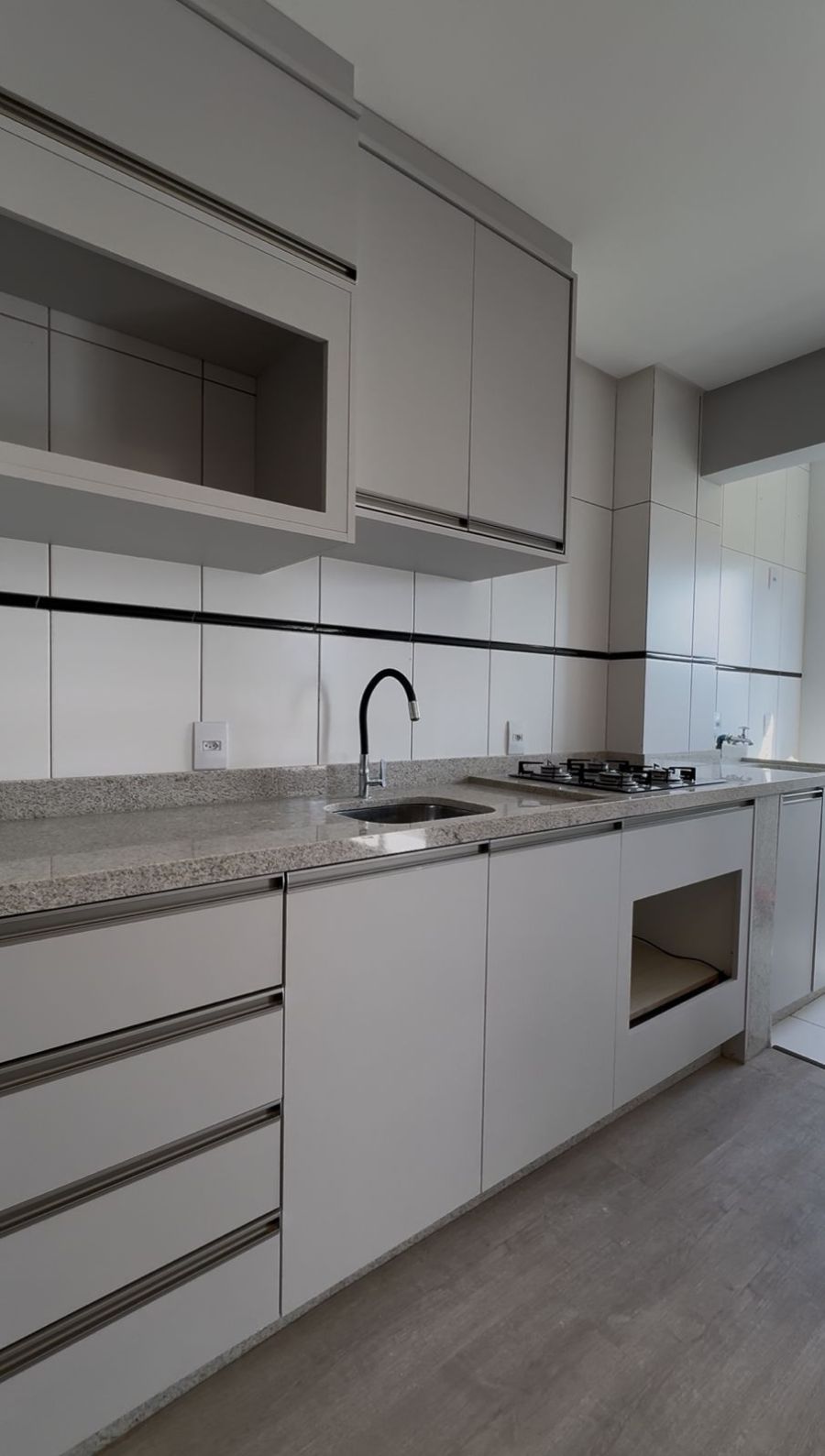 Piso vinílico, iluminação em LED e cozinha sob medida com bancada em pedra